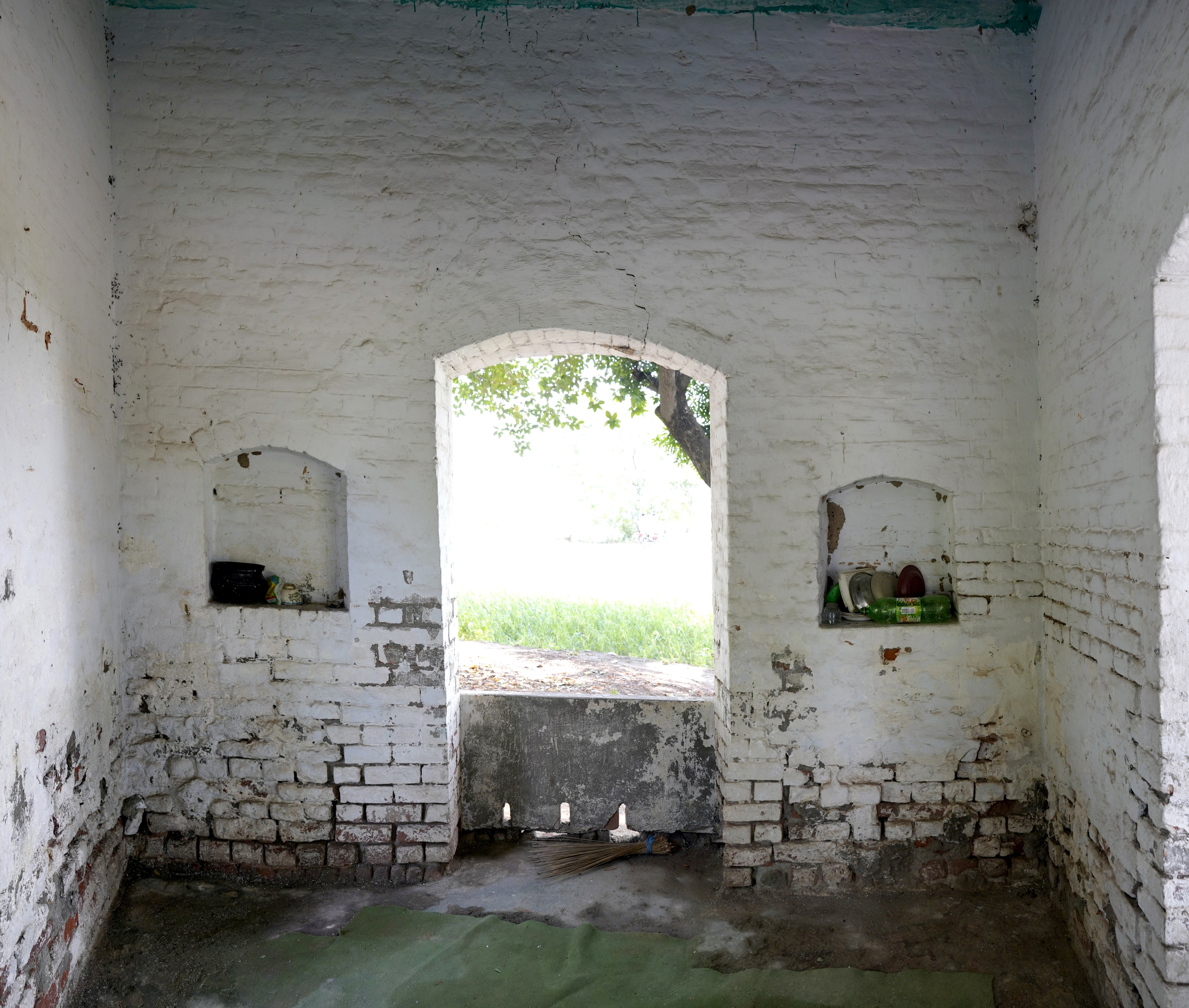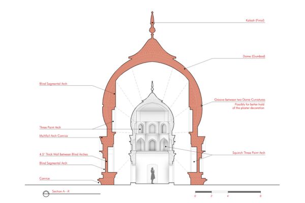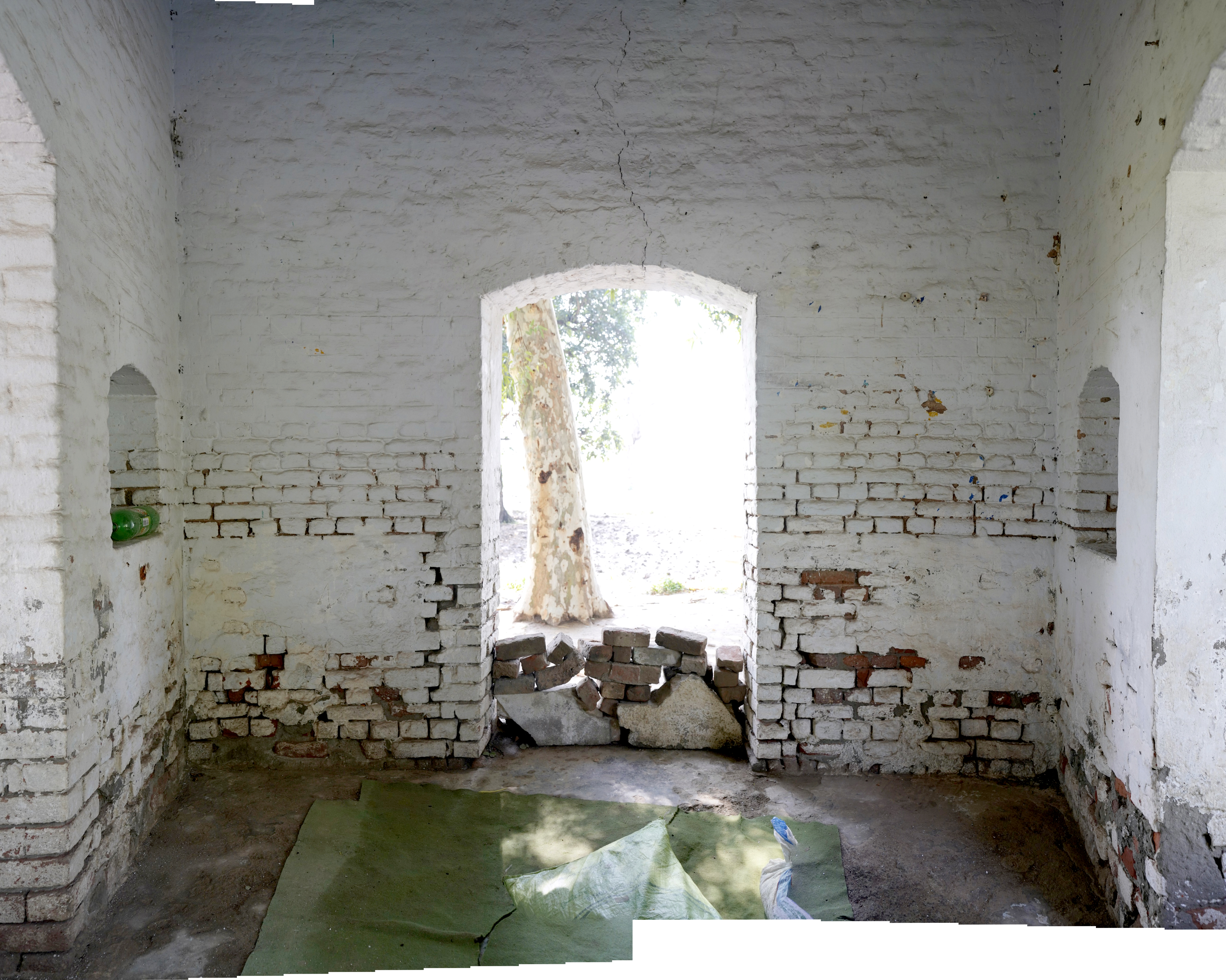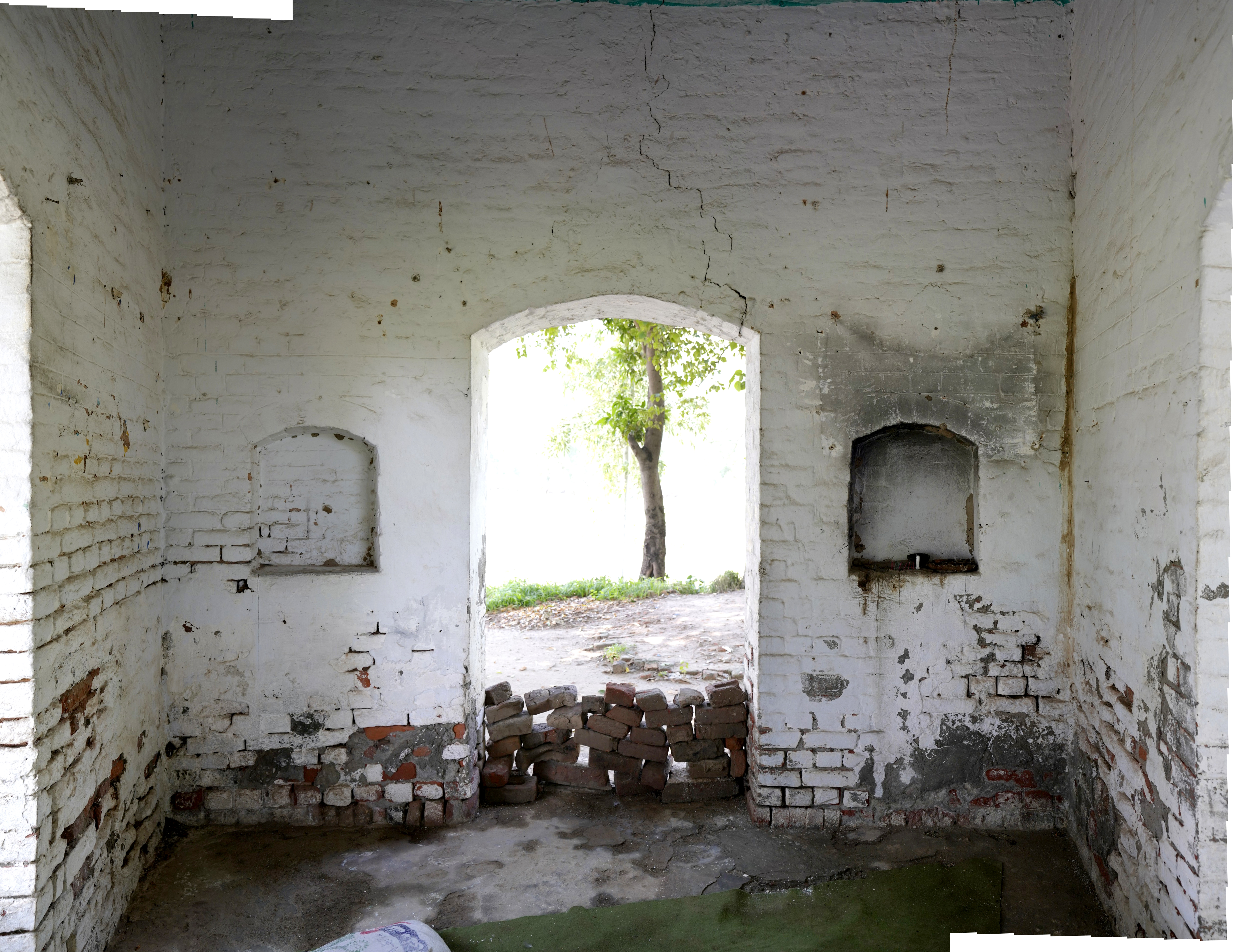 Unlike the elaborately finished and highly ornamental facades typical of other major gurdwaras, Gurdwara Sach Khand appears incomplete, which lends a distinct narrative to its architectural expression. The use of standard-sized bricks (9 x 4.5 x 3 inches) is evident throughout the structure, a detail that aligns with construction practices of the late colonial period. Furthermore, many grooves and shoulders of the arches indicate that the plasterwork, which would have added a layer of refinement and decoration, was never applied. These unfinished elements strongly suggest that the gurdwara was abandoned mid-construction, likely due to the Partition of India in 1947. It is possible that the gurdwara was intended to commemorate a story or event associated with Guru Nanak, but external circumstances halted its completion.